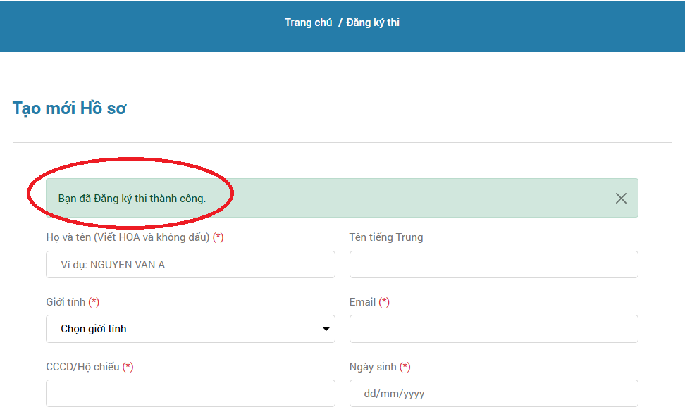 Sau khi đã điền đầy đủ thông tin, bấm vào Đăng ký thi, khi thấy thông báo như hình dưới là đã đăng ký thành công